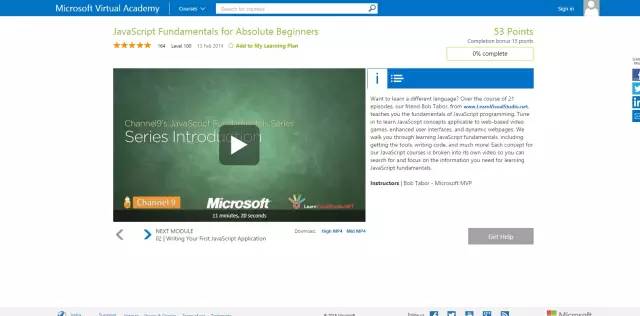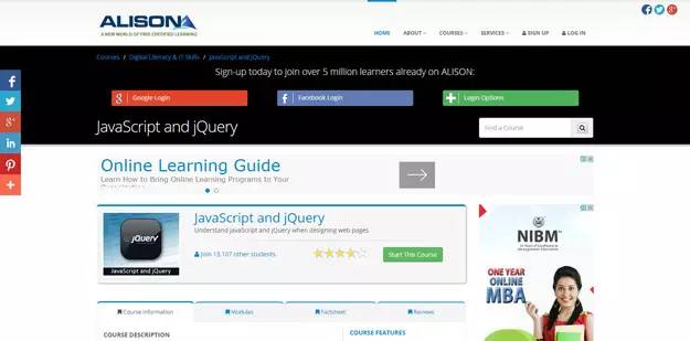 Alison 是一个在线的免费课程,只是针对JavaScript和jQuery。这套课程将会带你深入了解JavaScript 的各种相关主题,包含测试、函数、对象、数组、循环和各种语法知识。