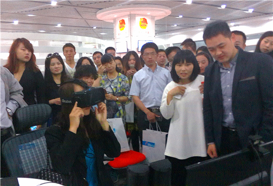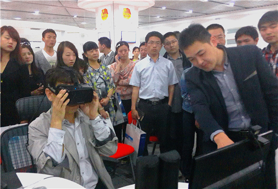走到云和数据3D模拟技术体验区,各位企业家都驻足观看,都似按耐不住好奇心,跃跃欲试,争相体验。在经过邢经理的详细介绍后,多位企业家有幸体验了我们公司研发的焦作云台山旅游项目,沉浸式体验令他们都发出由衷的赞叹。