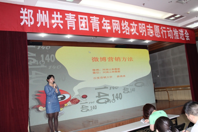 2015年5月22日下午,云和数据旗下云和学院百度营销名师薛燕清,受邀出席《郑州共青团青年网络文明志愿行动推进会》。现场100余名政府工作人员、院校团体、青年代表共同学习了薛老师带来的新媒体运营主题分享。
