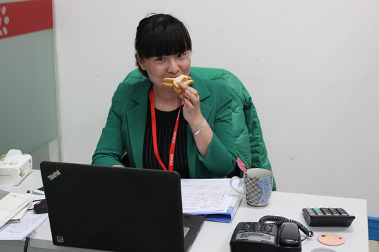 看到娜姐狼吞虎咽吃“午餐”时,时钟的指针告诉我已经是下午2点10分。突然看到我们,娜姐略显不好意思,毕竟大多女生吃饭都是比较斯文的。她说,这是无奈之举,因为要赶时间,很多事情要等着她去处理。久而久之这种吃饭方式就成了习惯。