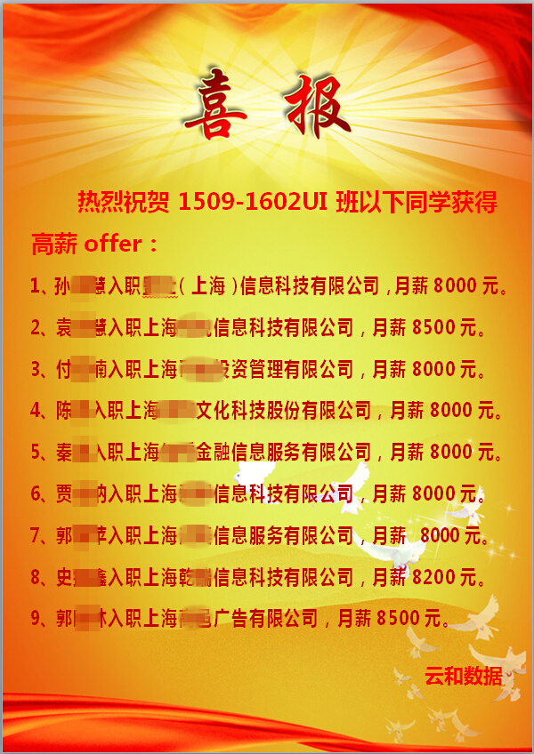 上图是合作企业直接将教室改成双选会现场的照片,这种情况几乎发生在云和学院的每一期毕业班里。除了受到哄抢之外,学员们的薪资待遇普遍也不低,韩总监向记者展示了上个月刚刚毕业的部分UI学员的就业喜报,记者看到,这些学生月薪都在八千元以上。