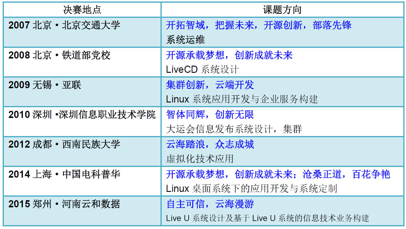 联合业界主流技术,构建最新产业技术导向,面向关注技术创新的院校和社区,在普及开源文化思想、开拓广博智域的基础上,将基于代表开源文化的Linux 系统技术,结合主流产业技术运用,融入到校园文化学习环境,通过参赛团队协同合作,展示创新意识下的真实技术运用成就。